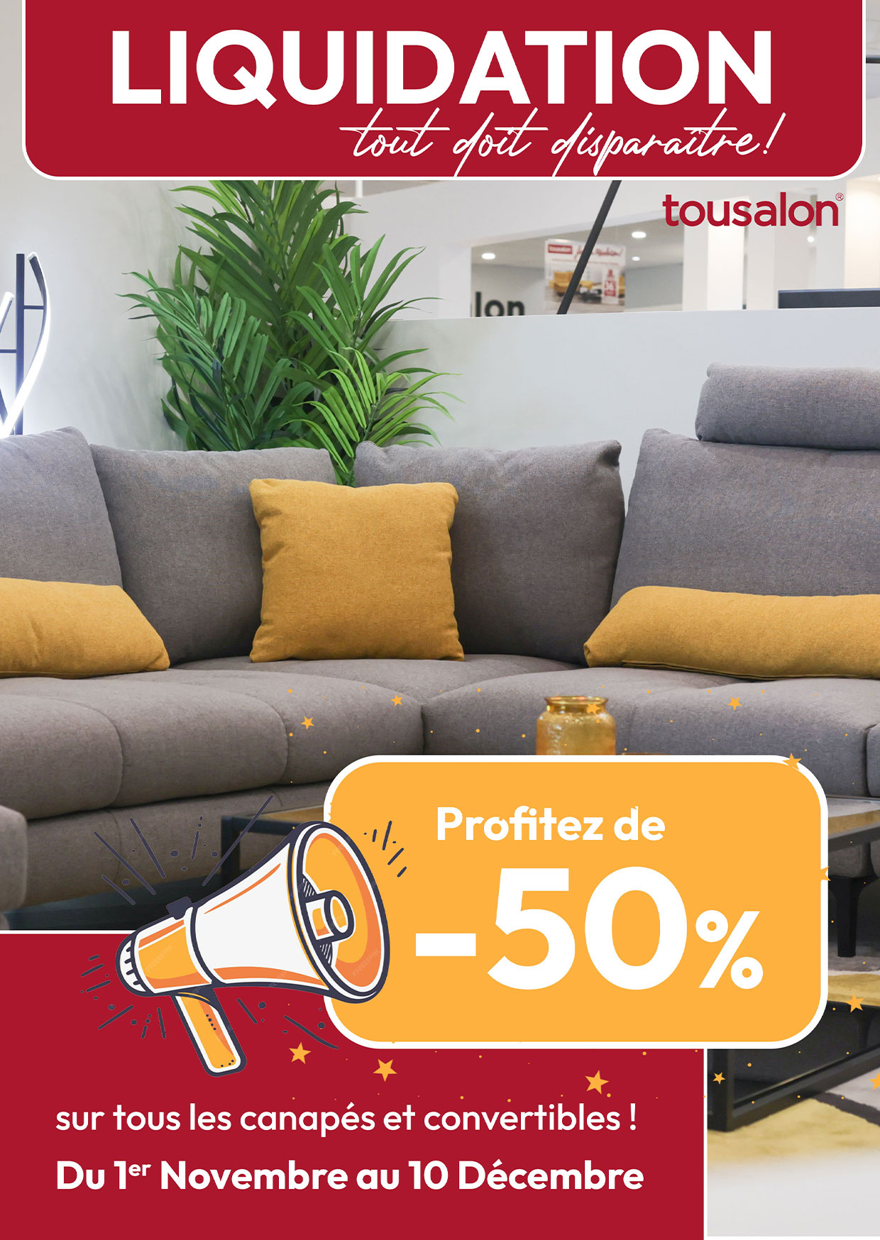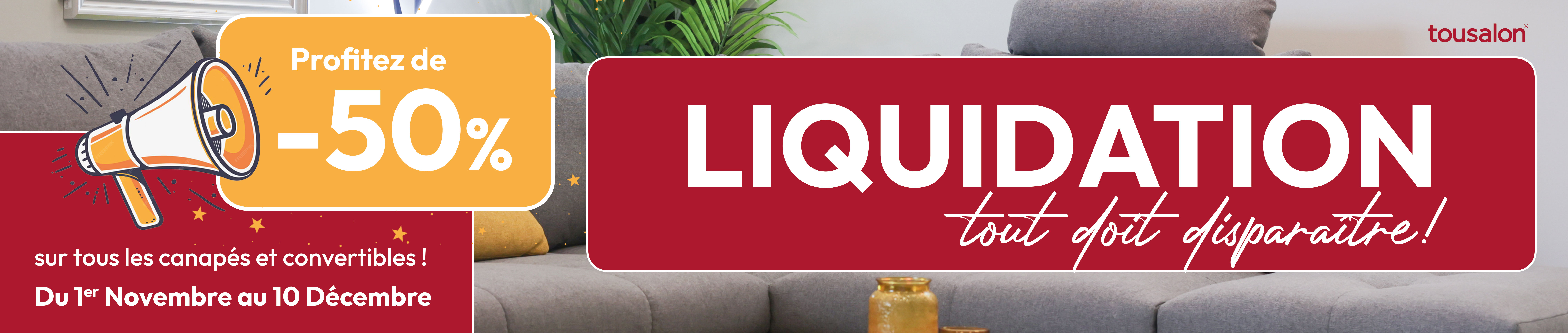 Liquidation exceptionnelle sur les canapés et convertibles ! Profitez de jusqu’à -50 % ! Tout doit disparaitre ! RDV en magasin pour en profiter.